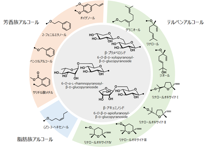 多くの植物は,揮発性化合物に「糖」を結合させ,香気前駆配糖体 (glycosidically bounds volatailes; GBVs) として貯蔵します (図1)。GBVsは,揮発性化合物より水溶性や沸点が高いため,植物中での安定的な貯蔵に適しており,植物が病害虫や病原菌にからの攻撃を受けた際,GBVsは植物由来の糖加水分解酵素によって,容易に揮発性化合物を遊離することができます。このように,GBVsは植物の化学防御システムの一端を担っています。